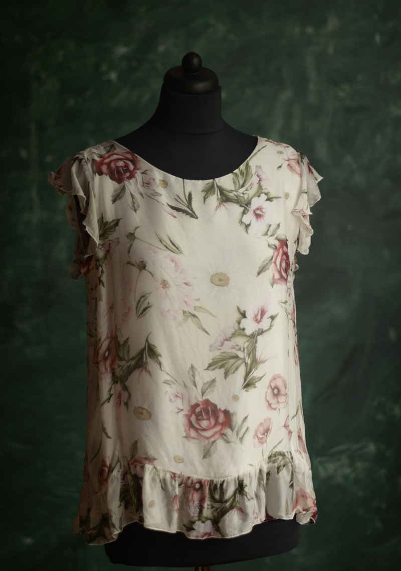 Pozn. na třetí fotografii je zachyceno lemování rukávu, které je na dvou místech mírně povolené - já osobně v tom nevidím vadu (halenka je celá takového nedbale rozvlněného dojmu), ale stačí pár stehů a vše je opraveno.