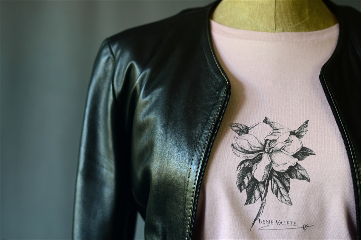 Botanická kresba květu velkolepé magnólie s ikonickým latinským nápisem "Bene Valete", což je formule s přáním všeho dobrého umisťovaná na konec středověkých listin.