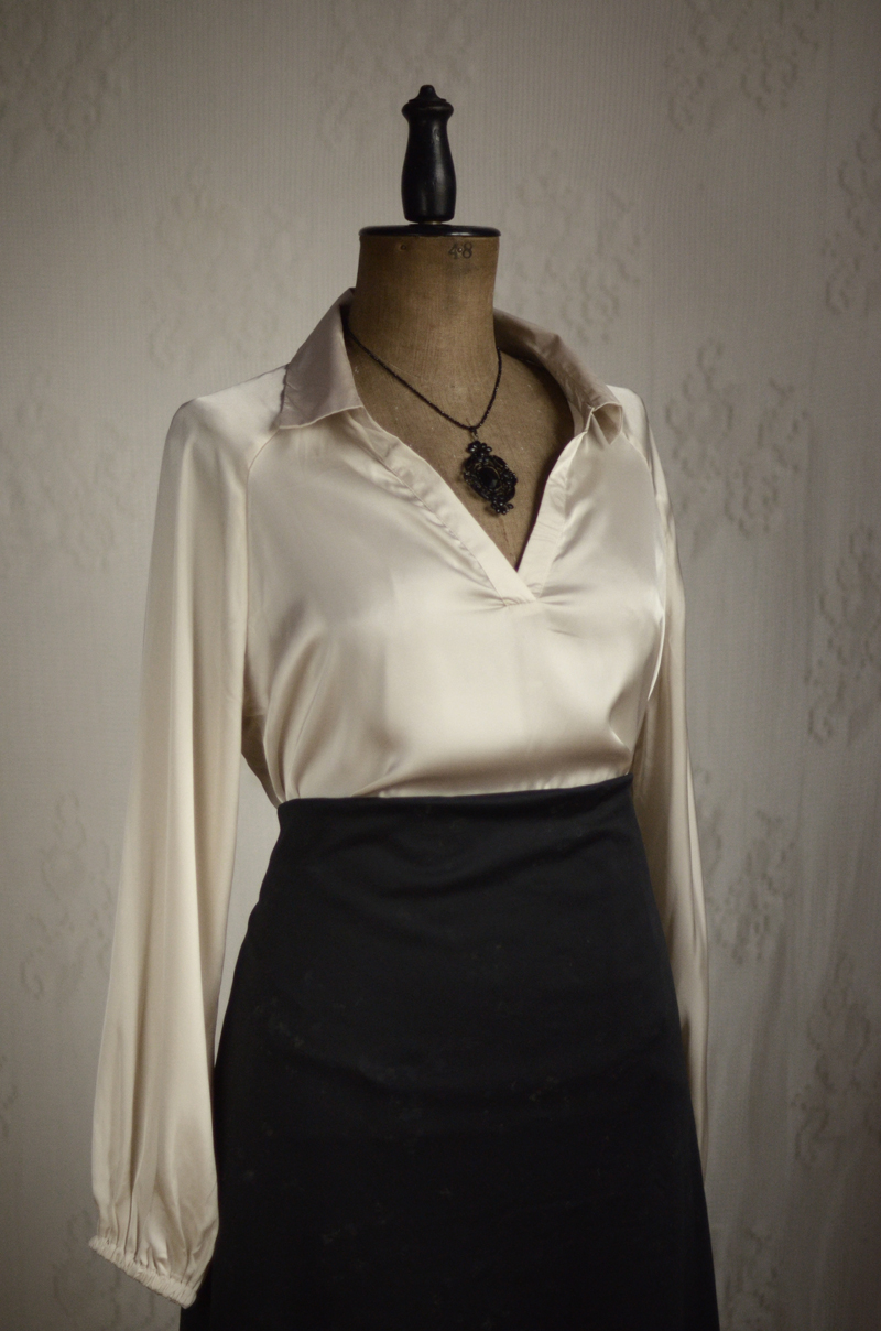 Lehká halenka nádherné barvy bílé kávy, jejíž půvab je zesílen leskem materiálu.