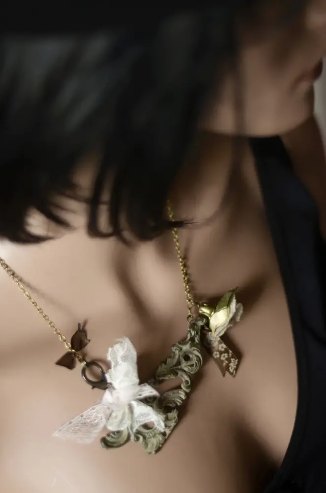 "Svoje šperky tvořím z nevšedních materiálů. Ústřižky vzácných látek, krajky, stužky, starožitné i nové komponenty a drobná ruční práce s tím vším - to je moje vášeň, kterou si chci občas dopřát. A tak vznikají moje šperky s náladou, jakou je ženský život sám: Občas nablýskané, občas omšelé a otřepané. Koketně dekadentní i cudné. Svůdně načančané, ale i nedbale syrové. Miluji spojovat nespojitelné."