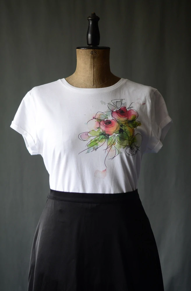 "Bílé tričko je jako bílý list ručního papíru ... vybízí k uměleckému využití. Nechat se unést akvarelovými barvami ... květinami ... inspirací ..."