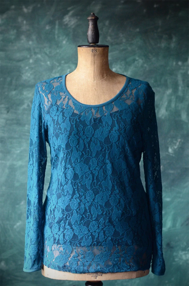 Uhrančivé spojení petrolejové barvy a krajkového materiálu.